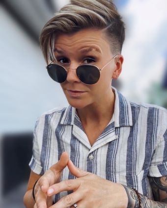 “It took me years to work through the constant pressure to look ‘girly.’ I was so uncomfortable with myself, even though I technically looked like what a stereotypical woman should look like (i.e., long hair, painted nails, tight clothes), but it just wasn’t me,” says Wilburn. “I would then fight with myself and think that I’d be even more uncomfortable if I cut my hair and dressed the way I wanted. As I got older, I realized that those concepts are made up and femininity isn’t defined by what we wear or what our hair looks like. I slowly started to wear what I wanted and felt great; the hair was the last to go,” she says. “I made a post about how I wanted to cut all my hair off and dye it blonde. Kyleen messaged me instantly and said she could get me in the next morning. It was set. My wife was so nervous for me—I was known for having ridiculously long hair. But I wasn’t nervous at all; something just clicked and I was ready. It was freeing knowing that soon it would be gone, and I knew I had the right stylist who could give me what I wanted. As soon as it was done, a weight felt like it had been lifted. I looked in the mirror and I had never felt so confident—that cut was made for me. I never thought a hairstyle could drastically change the way I saw myself, but it did. I wish I could bottle up that feeling and give it to people. Kyleen is a huge part of my story on self-discovery. I am forever grateful,” says Wilburn.
